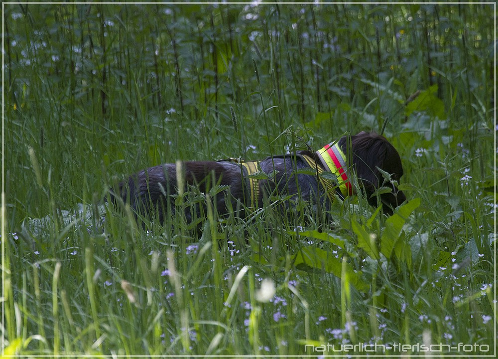 Ich bin sehr zufrieden mit ihm, das war richtig toll. Es ist schön ihn so zu sehen, frei laufend im hohen Gras, witternd, suchend, zurück zu mir schauend, er läßt sich wunderbar lesen, auch wenn er etwas interessantes entdeckt hat, läßt er sich gut abrufen und ich zögere nicht lange.